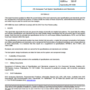 This report lists documents that aid and govern the design of aircraft and missile fuel systems. The report lists the military and industry specifications and standards and the most notable design handbooks that are commonly used in fuel system design. Note that only the principle fuel specifications for the U.S. and Europe (Military Specifications, ASTM, and Def Stan) have been included within this report.