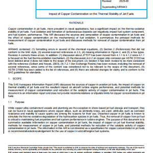 This SAE Aerospace Information Report (AIR) discusses the sources of copper in aviation jet fuels, the impact of copper on thermal stability of jet fuels and the resultant impact on aircraft turbine engine performance, and potential methods for measurement of copper contamination and reduction of the catalytic activity of copper contamination in jet fuels. This document is an information report and does not provide recommendations or stipulate limits for copper concentrations in jet fuels.