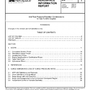 AIR1419 “Inlet Total Pressure Distortion Considerations for Gas Turbine Engines” documents engineering information for use as reference material and for guidance. Inlet total-pressure distortion and other forms of flow distortion that can influence inlet/engine compatibility require examination to establish their effect on engine stability and performance. This report centers on inlet-generated total-pressure distortion measured at the Aerodynamic Interface Plane (AIP), not because this is necessarily the sole concern, but because it has been given sufficient attention in the aircraft and engine communities to produce generally accepted engineering practices for dealing with it. The report does not address procedures for dealing with performance destabilizing influences other than those due to total-pressure distortion, or with the effects of any distortion on aeroelastic stability. The propulsion system designer must be careful to assure that, throughout the development process, other forms of inlet flow distortion, which can have just as serious effects on system stability and performance, have been effectively addressed.