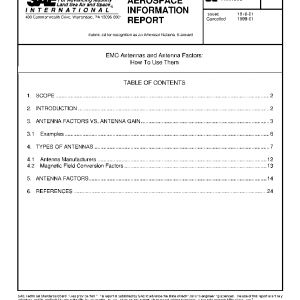 This AIR discusses the use and application of EMC antennas and antenna factors. The relationships between antenna gain, antenna factor, power density (W/m2), and field strength (V/m) are discussed. Some examples of their use are given. Illustrations of commercially available EMC antennas commonly used in performing EMI measurements are included. In addition to the illustrations, the antenna factors, frequency ranges, typical uses (applications), and the manufacturers of these antennas are also listed.