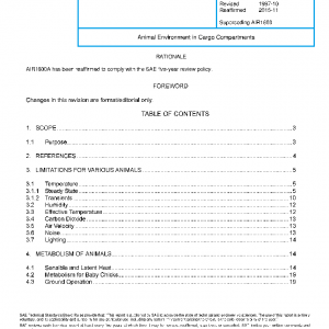 This report presents information on the temperature, humidity, ventilation, and carbon dioxide limitations and the metabolic heat release rates for animals which will allow the determination of the environment required by the animals. Design features of ventilated and nonventilated cargo compartments are presented. Methods of calculation of the temperature, humidity, and carbon dioxide environment are provided that will allow for the determination of the animal capacities of animal carrying cargo compartments. Animals are being carried in the lower cargo compartments on passenger carrying aircraft which are only provided with coarse temperature control. These compartments provide a very satisfactory environment for most animals if knowledge of the animal’s requirements are matched with the compartment’s capability to produce that environment.
