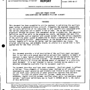 The document describes auxiliary power equipment. Auxiliary power is defined as follows: “Those elements of secondary power [defined as all aircraft nonpropulsive power generation and transmission] related to main engine bleed air and shaft power extraction or power generation separate from the main engines. Included are engine bleed air systems, remote engine driven gearboxes, engine starting systems, auxiliary power units, and emergency power systems.” Additional definitions may be found in ARP906A which is the source of this definition.