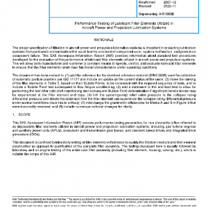 This document is confined to laboratory testing of filter element performance to qualify the filtration medium and filter element construction as opposed to qualification of the complete filter assembly. The testing discussed here is usually followed by laboratory and on-engine testing of the entire lube filter assembly (including filter element, housing, valving, etc.), which is outside the scope of this AIR.