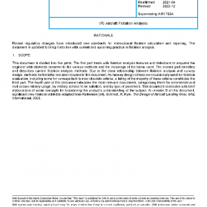 This document is divided into five parts. The first part deals with flotation analysis features and definitions to acquaint the engineer with elements common to the various methods and the meanings of the terms used. The second part identifies and describes current flotation analysis methods. Due to the close relationship between flotation analysis and runway design, methods for the latter are also included in this document. As runway design criteria are occasionally used for flotation evaluation, including some for runways built to now obsolete criteria, a listing of the majority of these criteria constitutes the third part. The fourth part of this document tabulates the most relevant documents, categorizing them for commercial and civil versus military usage, by military service to be satisfied, and by type of pavement. This document concludes with brief elaborations of some concepts for broadening the analyst’s understanding of the subject. At revision B of this document, significant new material added is adapted from Reference [34], Schmidt, R. Kyle, The Design of Aircraft Landing Gear, SAE International, 2020.