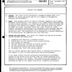 This document covers the field of civilian, commercial and military airplanes and helicopters. This summary of tail bumper design approaches may be used by design personnel as a reference and guide for future airplanes and helicopters that require tail bumpers. Those described herein will consist of simple rub strips, structural loops with a wear surface for runway contact, retractable installations with replaceable shock absorbers and wear surfaces and complicated retractable tail landing gears with shock strut, wheels and tires. The information will be presented as a general description of the installation, its components and their functions.