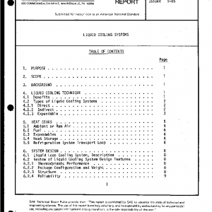 This publication is applicable to liquid cooling systems of the closed loop type and the expendable coolant type in which the primary function is transporting of heat from its source to a heat sink. Most liquid cooling system applications are oriented toward the cooling of electronics. Liquid cooling techniques, heat sinks, design features, selection of coolants, corrosion control, and servicing requirements for these systems are presented. Information on vapor compression refrigeration systems, which are a type of cooling system, is found in Reference 1.