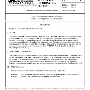 This SAE Aerospace Information Report (AIR) identifies Propulsion Engineer’s recommendations for the instrumentation that is required for the safe operation and maintenance of turbine engines as installed in helicopters. It should be used as a guide for cockpit layout, as well as a reference for maintenance considerations throughout the propulsion area. Propulsion instruments should receive attention early in the design phase of the helicopter. Maintenance and diagnostics recorders are not considered within the scope of this document. (See ARP1587, “Aircraft Gas Turbine Engine Monitoring System Guide”.)