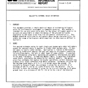 This method estimates noise for both single and tandem main rotor helicopters except for approach where it applies to single rotor designs only. It does not apply to coaxial rotor designs. Application is limited to helicopters powered by turbo-shaft engines and does not apply to helicopters powered by reciprocating engine, tip jets or other types of power plants. It provides noise information using basic operating and geometric information available in the open literature. To keep the method simple, it generates A-weighted sound levels, precluding the necessity for spectral details. The method prescribes estimates for typical helicopter operations; certain maneuvers may produce noise levels different from those estimated. Estimates are given for the maximum sound levels at 4 ft (1.2 m) height above the ground. For aircraft in forward flight, the estimate is given for an aircraft at an altitude of 500 ft (152 m) on a path directly over the observer. For an aircraft in hover the estimate is given for an aircraft hovering 10 ft above ground level at a distance of 500 ft (152 m) to the side of the observer.