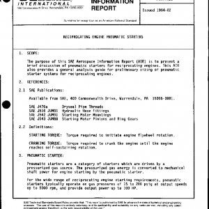 The purpose of this SAE Aerospace Information Report (AIR) is to present a brief discussion of pneumatic starters for reciprocating engines. This AIR also provides a general analysis guide for preliminary sizing of pneumatic starter systems for reciprocating engines.
