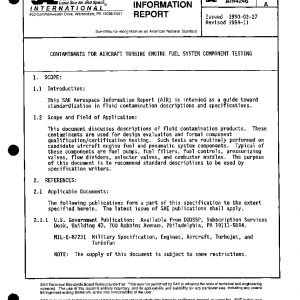 This document discusses descriptions of fluid contamination products. These contaminants are used for design evaluation and formal component qualification/certification testing. Such tests are routinely performed on candidate aircraft engine fuel and pneumatic system components. Typical of these components are fuel pumps, fuel filters, fuel controls, pressurizing valves, flow dividers, selector valves, and combustor nozzles. The purpose of this document is to recommend standard descriptions to be used by specification writers.