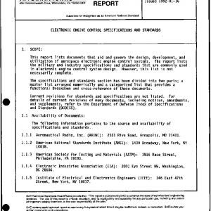 This report lists documents that aid and govern the design, development, and utilization of aerospace electronic engine control systems. The report lists the military and industry specifications and standards that are commonly used in electronic engine control system design. However, this list is not necessarily complete.