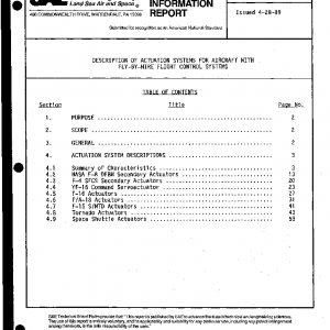 This AIR provides a description of representative state-of-the-art, fly-by-wire (FBW) actuation systems used in flight control systems of manned aircraft. It presents the basic characteristics, hardware descriptions, redundancy concepts, functional schematics, and discussions of the servo controls, failure monitoring, and fault tolerance. All existing FBW actuation systems are not described herein; however, those most representing the latest designs are included. While this AIR is intended as a reference source of information for future aircraft actuation system designs, the exclusion or omission of any other appropriate actuation system or subsystem should not limit consideration of their use on future aircraft.