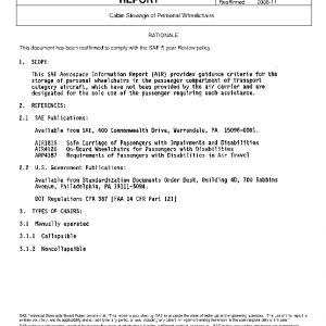 This SAE Aerospace Information Report (AIR) provides guidance criteria for the storage of personal wheelchairs in the passenger compartment of transport category aircraft, which have not been provided by the air carrier and are designated for the sole use of the passenger requiring such assistance.