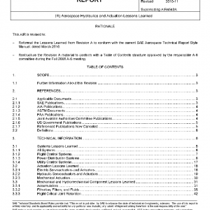 This SAE Aerospace Information Report (AIR) contains Lessons Learned from aerospace actuation, control and fluid power systems technologies. The lessons were prepared by engineers from the aerospace industry and government services as part of SAE Committee A-6, Aerospace Fluid Power, Actuation, and Control Technologies, and were presented to the A-6 during meetings held from 1989 through 1999. The document is organized into five sections covering systems, actuation, hydromechanical components, electrical components and miscellaneous, each further divided into subsections. The lessons are presented in a concise format of Problem, Issue, Solution and Lesson Learned, often with accompanying descriptive diagrams and illustrations for clarity and understanding.