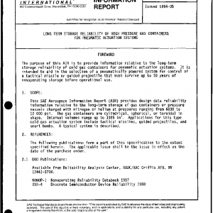 This SAE Aerospace Information Report (AIR) provides design data reliability information relative to the long-term storage of gas containers or pressure vessels charged with nitrogen or helium at pressures ranging from 6000 to 12 000 psi. The gas containers are cylindrical, spherical, or toroidal in shape. Internal volumes range up to 1385 in3. Applications for this type cold gas actuation system include tactical missiles, guided projectiles, and smart bombs. A typical system is described.