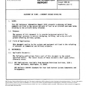 This SAE Aerospace Information Report (AIR) presents a glossary of terns commonly utilized in the ground delivery of fuel to an aircraft and some terms relating to the aircraft being refueled.