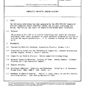 The following terminology has been generated by the ATA/IATA/SAE Commercial Aircraft Composite Repair Committee (CACRC) and provides terminology for design, fabrication, and repair of composite and bonded metal structures.