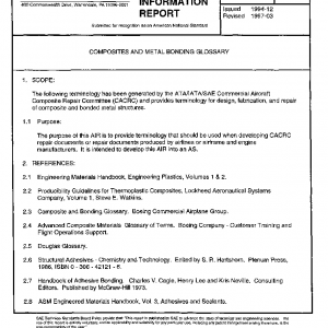 The following terminology has been generated by the ATA/IATA/SAE Commercial Aircraft Composite Repair Committee (CACRC) and provides terminology for design, fabrication, and repair of composite and bonded metal structures.