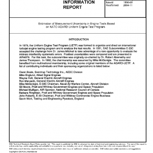 The primary objective of this document is to describe the systematic and random measurement uncertainties which may be expected when testing gas turbine engines in a range of different test facilities. The documentation covers a “traditional” method for estimating pretest uncertainties and a “new” method for computing and comparing posttest uncertainties. To determine these posttest uncertainties, data generated during the AGARD Uniform Engine Test Program (UETP) were analyzed and compared to the pretest estimates.