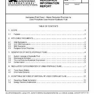 This SAE Aerospace Information Report (AIR) covers the generation of used phosphate ester aviation hydraulic fluid (AS1241) that is deemed waste because it does not meet in-service limits for use in aircraft. This document also lists the relevant United States Environmental Protection Agency (U.S. EPA) regulations on used hydraulic fluid that are in force at the time of this report’s publication. Regulations of other countries as well as those for states and municipalities should be consulted prior to initiating any of the waste disposal recommendations listed here.