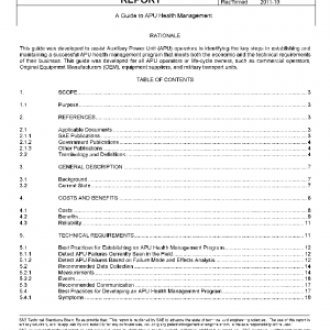 The SAE Guide to APU health management establishes the foundation for developing a successful APU health management program at any aircraft or APU operator, such as an airline, an OEM, an equipment supplier, or a military transport unit. This guide identifies the best practices for using an APU health management program to improve dispatch reliability and to satisfy Extended Operations (ETOPS) availability requirements.