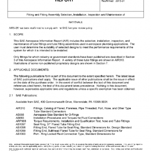 This SAE Aerospace Information Report (AIR) includes the selection, installation, inspection, and maintenance of tube fittings and tube fitting assemblies used in aerospace plumbing applications. The user must determine the suitability of selected designs to meet the performance requirements of the system for which it is intended to be installed.