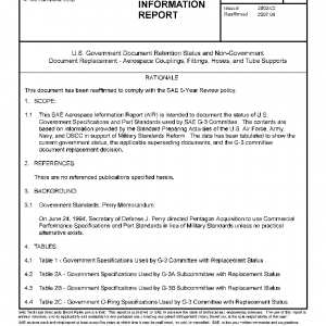 This SAE Aerospace Information Report (AIR) is intended to document the status of U.S. Government Specifications and Part Standards used by SAE G-3 Committee. The contents are based on information provided by the Standard Preparing Activities of the U.S. Air Force, Army, Navy, and DSCC in support of Military Standards Reform. The data has been tabulated to show the current government status, the applicable superseding documents, and the G-3 committee document replacement decision.