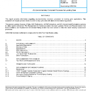This SAE Aerospace Information Report (AIR) describes the performance of plating’s and coatings for landing gear that potentially provide environmental compliance benefits versus the current baseline processes. The hazardous systems addressed in this version of the document include cadmium plating, chromated primers, and high VOC (volatile organic compounds) topcoats.