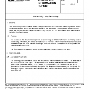 This SAE Aerospace Information Report (AIR) provides definitions for terms commonly used in aircraft inflight icing system design and analysis, research, and operations. Some general thermodynamic terms are included that are frequently used in icing analysis, but this document is not meant to be an inclusive list of such terms.