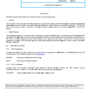 The purpose of this Aerospace Information Report is to provide the industry with methodologies for measuring tire/wheel gear alignment and the range of acceptable alignment settings for various types of non-military landing gear. This AIR will focus on the general aviation, corporate, and regional aircraft landing gear but could have applicability to commercial aircraft.
