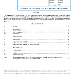 The purpose of this report is to provide information on the results of ultraviolet (UV) laser marking and mark contrast measurement of a wide range of aerospace wire and cable constructions, the specifications for most of which do not state specific requirements for laser markability. The contents of this document are for information and guidance only. It is not intended that it be used as the basis for marking process specifications or standards, which are covered by AS5649.