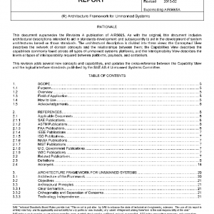 This SAE Aerospace Information Report (AIR) describes the Architecture Framework for Unmanned Systems (AFUS). AFUS comprises a Conceptual View, a Capabilities View, and an Interoperability View. The Conceptual View provides definitions and background for key terms and concepts used in the unmanned systems domain. The Capabilities View uses terms and concepts from the Conceptual View to describe capabilities of unmanned systems and of other entities in the unmanned systems domain. The Interoperability View provides guidance on how to design and develop systems in a way that supports interoperability.