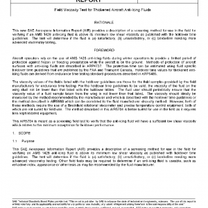 This SAE Aerospace Information Report (AIR) provides a description of a screening method for use in the field for verifying an AMS 1428 anti-icing fluid is above its minimum low shear viscosity as published with holdover time guidelines. The test will determine if the fluid is (a) satisfactory, (b) unsatisfactory, or (c) borderline needing more advanced viscometry testing. Other field tests may be required to determine if an anti-icing fluid is useable, such as refractive index, appearance or other tests as may be recommended by the fluid manufacturer.