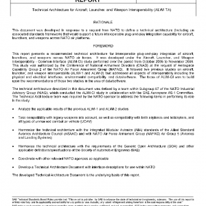 The technical architecture defined in this document outlines mandatory, emerging, and needed standards to provide interoperability at key interfaces in the aircraft/store system (including an associated NATO Network Enabled Capability environment), as required to support a future plug-and-play aircraft/store integration capability. These standards relate to services and protocols associated with the subject interfaces. Modeling standards to facilitate the Model Driven Architecture® (MDA®) approach to system definition and implementation are also included. Note that the status of referenced standards as reflected in this document is as of August 2007, and document users should check to see if there has been a subsequent change of status relative to applicable standards.