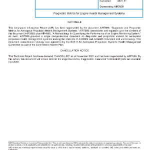 This SAE Aerospace Information Report (AIR) presents metrics for assessing the performance of prognostic algorithms applied for Engine Health Management (EHM) functions. The emphasis is entirely on prognostics and as such is intended to provide an extension and complement to such documents as AIR5871, which offers information and guidance on general prognostic approaches relevant to gas turbines, and AIR4985 which offers general metrics for evaluating diagnostic systems and their impact on engine health management activities.
