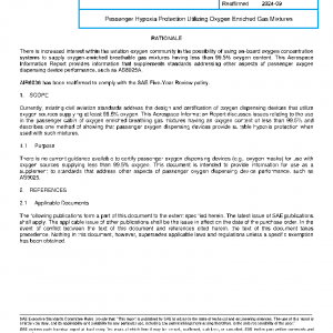 Currently, existing civil aviation standards address the design and certification of oxygen dispensing devices that utilize oxygen sources supplying at least 99.5% oxygen. This Aerospace Information Report discusses issues relating to the use in the passenger cabin of oxygen enriched breathing gas mixtures having an oxygen content of less than 99.5% and describes one method of showing that passenger oxygen dispensing devices provide suitable hypoxia protection when used with such mixtures.
