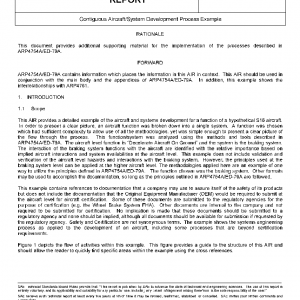 This AIR provides a detailed example of the aircraft and systems development for a function of a hypothetical S18 aircraft. In order to present a clear picture, an aircraft function was broken down into a single system. A function was chosen which had sufficient complexity to allow use of all the methodologies, yet was simple enough to present a clear picture of the flow through the process. This function/system was analyzed using the methods and tools described in ARP4754A/ED-79A. The aircraft level function is “Decelerate Aircraft On Ground” and the system is the braking system. The interaction of the braking system functions with the aircraft are identified with the relative importance based on implied aircraft interactions and system availabilities at the aircraft level. This example does not include validation and verification of the aircraft level hazards and interactions with the braking system. However, the principles used at the braking system level can be applied at the higher aircraft level. The methodologies applied here are an example of one way to utilize the principles defined in ARP4754A/ED-79A. The function chosen was the braking system. Other formats may be used to accomplish the documentation, so long as the principles outlined in ARP4754A/ED-79A are followed.