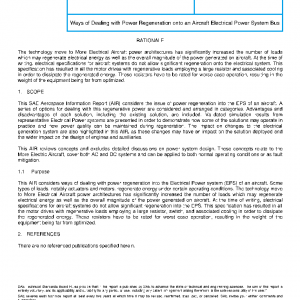 This SAE Aerospace Information Report (AIR) considers the issue of power regeneration into the EPS of an aircraft. A series of options for dealing with this regenerative power are considered and arranged in categories. Advantages and disadvantages of each solution, including the existing solution, are included. Validated simulation results from representative Electrical Power systems are presented in order to demonstrate how some of the solutions may operate in practice and how power quality can be maintained during regeneration. The impact on changes to the electrical generation system are also highlighted in this AIR, as these changes may have an impact on the solution deployed and the wider impact on the design of engines and auxiliaries.