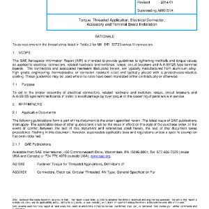 This SAE Aerospace Information Report (AIR) is intended to provide guidelines to tightening methods and torque values as applied to electrical connectors, related hardware and switches, relays, circuit breakers and A-A-59125 type terminal boards. The connectors and associated hardware discussed herein, are typically manufactured from aluminum alloy, high grade engineering thermoplastics or corrosion resistant steel and typically plated with a protective/conductive coating. These guidelines may be used where no rules have been mandated either contractually or otherwise.