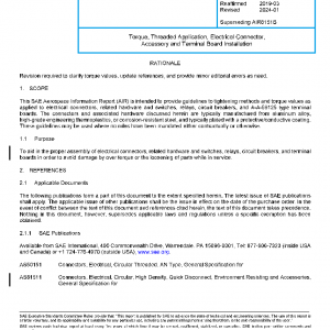 This SAE Aerospace Information Report (AIR) is intended to provide guidelines to tightening methods and torque values as applied to electrical connectors, related hardware and switches, relays, circuit breakers, and A-A-59125 type terminal boards. The connectors and associated hardware discussed herein are typically manufactured from aluminum alloy, high-grade engineering thermoplastics, or corrosion-resistant steel, and typically plated with a protective/conductive coating. These guidelines may be used where no rules have been mandated either contractually or otherwise.