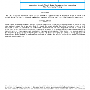 This document provides informational background, rationale and a technical case to allow consideration of the removal of the magnesium alloy restriction in aircraft seat construction as contained in AS8049B. The foundation of this argument is flammability characterization work performed by the FAA at the William J. Hughes Technical Center (FAATC), Fire Safety Branch in Atlantic City, New Jersey, USA. The rationale and detailed testing results are presented along with flammability reports that have concluded that the use of specific types of magnesium alloys in aircraft seat construction does not increase the hazard level potential in the passenger cabin in a post-crash fire scenario. Further, the FAA has developed a lab scale test method, reference DOT/FAA/TC-13/52, to be used as a certification test, or method of compliance (MOC) to allow acceptability of the use of magnesium in the governing TSO-C127 and TSO-C39C.