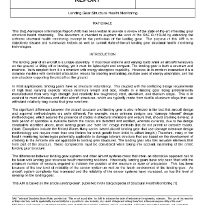 This SAE Aerospace Information Report (AIR) discusses past and present approaches for monitoring the landing gear structure and shock absorber, methods for transient overload detection, techniques for measuring the forces seen by the landing gear structure, and methods for determining the fatigue state of the landing gear structure. This AIR covers the landing gear structure and shock absorber. It does not include the landing gear systems or landing gear wheels, tires and brakes. Landing gear tire condition and pressure monitoring are detailed in AIR4830 and ARP6137, respectively.