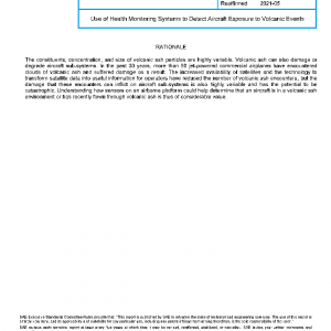 This document collates the ways and means that existing sensors can identify the platform’s exposure to volcanic ash. The capabilities include real-time detection and estimation, and post flight determinations of exposure and intensity. The document includes results of initiatives with the Federal Aviation Administration (FAA), the European Aviation Safety Agency (EASA), the International Civil Aviation Organization (ICAO), Transport Canada, various research organizations, Industry and other subject matter experts. The document illustrates the ways that an aircraft can use existing sensors to act as health monitoring tools so as to assess the operational and maintenance effects related to volcanic ash incidents and possibly help determine what remedial action to take after encountering a volcanic ash (VA) event. Finally, the document provides insight into emerging technologies and capabilities that have been specifically pursued to detect volcanic ash encounters but are not yet a part of an airplane’s standard fit.