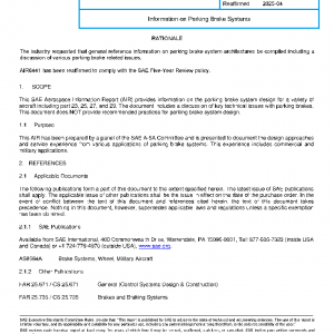This SAE Aerospace Information Report (AIR) provides information on the parking brake system design for a variety of aircraft including part 23, 25, 27, and 29. The document includes a discussion of key technical issues with parking brakes. This document does NOT provide recommended practices for parking brake system design.