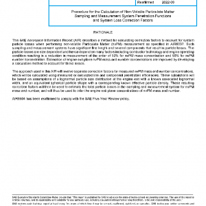 This SAE Aerospace Information Report (AIR) describes a method for assessing size dependent particle losses in a sampling and measurement system of specified geometry utilizing the non-volatile PM (nvPM) mass and number concentrations measured at the end of the sampling system.1 The penetration functions of the sampling and measurement system may be determined either by measurement or by analytic computational methods.
