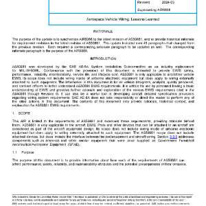 This AIR is limited to the requirements of AS50881 and examines these requirements, providing rationale behind them. AS50881 is only applicable to the aircraft EWIS. Pods and other devices that can be attached to an aircraft are considered as part of the aircraft equipment design. Its scope does not include wiring inside of airborne electronic equipment but does apply to wiring externally attached to such equipment. The AS50881 scope does not include attached devices but does include the interface between the pod/equipment and aircraft wiring. Section 3.3.5 addresses components such as antennas and other similar equipment that were once supplied as Government Furnished Aeronautical/Aerospace Equipment (GFAE).