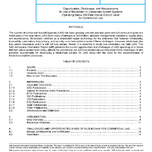 This SAE Aerospace Information Report (AIR) focuses on opportunities, challenges, and requirements in use of blockchain for Unmanned Aircraft Systems (UAS) operating at and below 400 feet above ground level (AGL) for commercial use. UAS stakeholders like original equipment manufacturers (OEMs), suppliers, operators, owners, regulators, and maintenance repair and overhaul (MRO) providers face many challenges in certification, airspace management, operations, supply chain, and maintenance. Blockchain—defined as a distributed ledger technology that includes enterprise blockchain—can help address some of these challenges. Blockchain technology is evolving and also poses certain concerns in adoption. This AIR provides information on the current UAS challenges and how these challenges can be addressed by deploying blockchain technology along with identified areas of concern when using this technology. The scope of this AIR includes elicitation of key requirements for blockchain in UAS across its life cycle and the need for the standardization of blockchain-enabled processes.