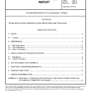 This document supplements ARP85, to extend its use in the design of ECS for supersonic transports. The ECS provides an environment controlled within specified operational limits of comfort and safety, for humans, animals, and equipment. These limits include pressure, temperature, humidity, conditioned air velocity, ventilation rate, thermal radiation, wall temperature, audible noise, vibration, and composition (ozone, contaminants, etc.) of the environment. The ECS is comprised of equipment, controls, and indicators that supply and distribute conditioned air to the occupied compartments. This system is defined within the ATA 100 specification, Chapter 21. It interfaces with the pneumatic system (Chapter 36 of ATA 100), at the inlet of the air conditioning system shutoff valves.