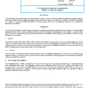 This SAE Aerospace Information Report (AIR) contains data relative to the chemical nature of aerospace fluids and relates each to its empirical effect upon elastomeric components. Since the compatibilities of elastomers are determined by the compounding as well as the nature of the base polymer, the elastomers considered are limited to finished compounds for which material or performance specifications can be referenced.