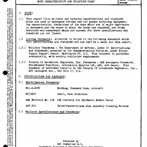 This report lists military and industry specifications and standards which are used in aerospace systems and for ground servicing equipment. The characteristic limitations of the hose which are of major importance to designers and the sizes in which the hoses are standard, are shown. Revisions and amendments which are current for these specifications and standards are not listed.